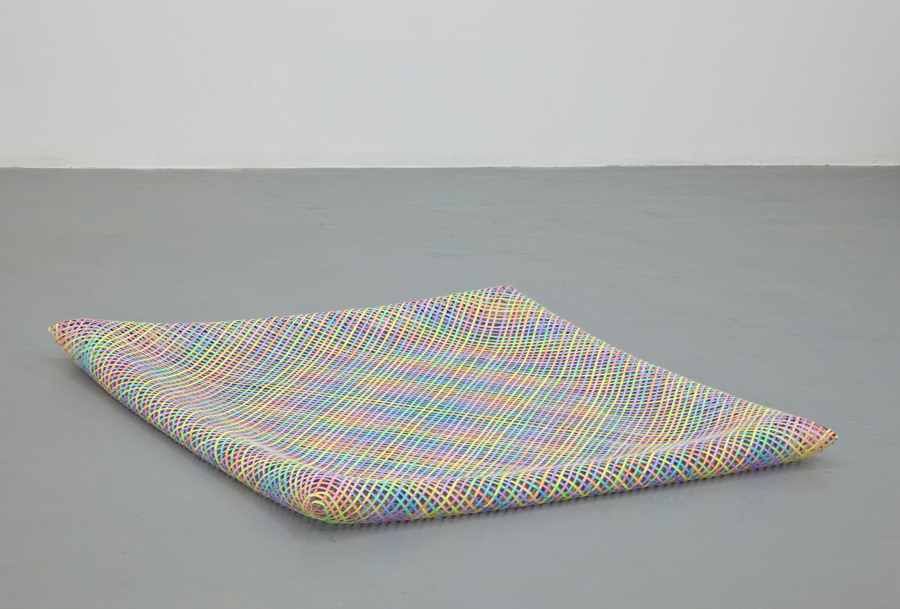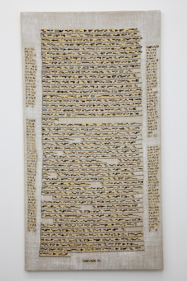Through a variety of processes connected to the act of weaving, Through The Warp presents seven different approaches to the same overarching structurematerial building upon material via linear repetition and overlap. From woven fibers and pigments to language and pixels, artists Joell Baxter, Karl Erickson, John Houck, Beryl Korot, Jamisen Ogg, Mike Parι and Lawrence Weiner engage with this ancient framework in ways that warp prior perceptions of familiar structures, or even put forth a new language altogether.