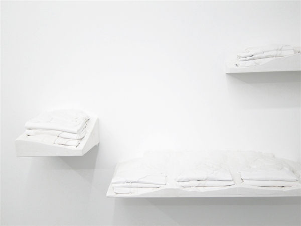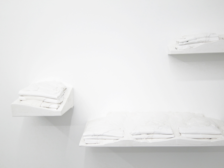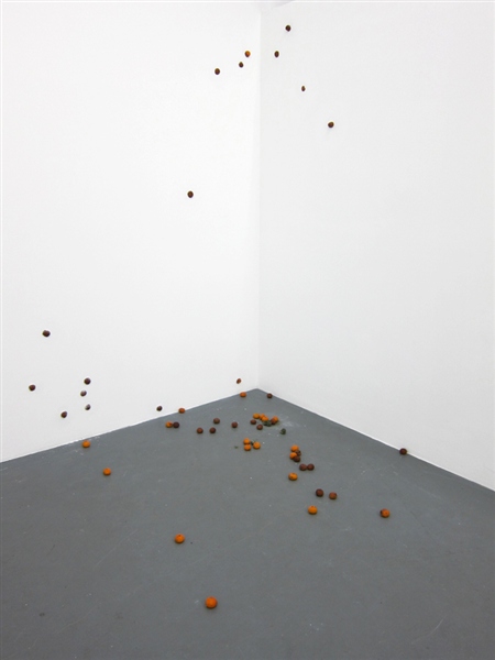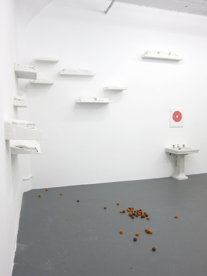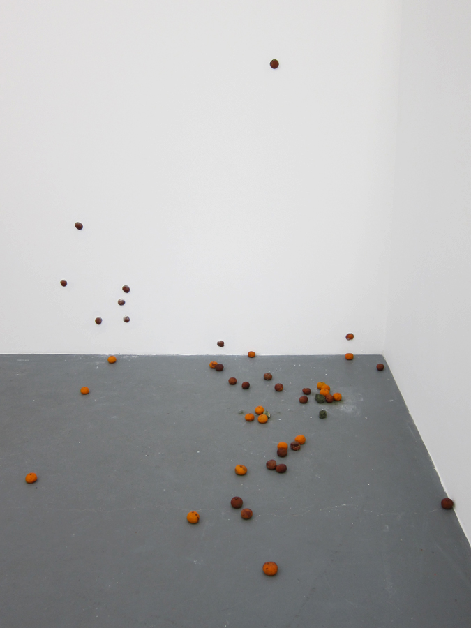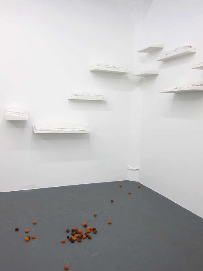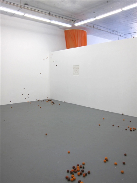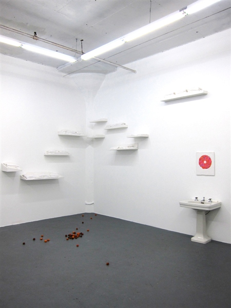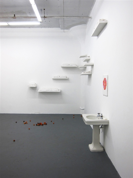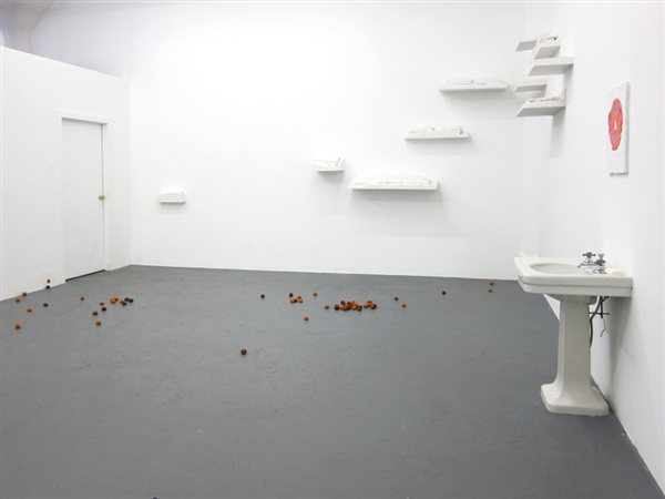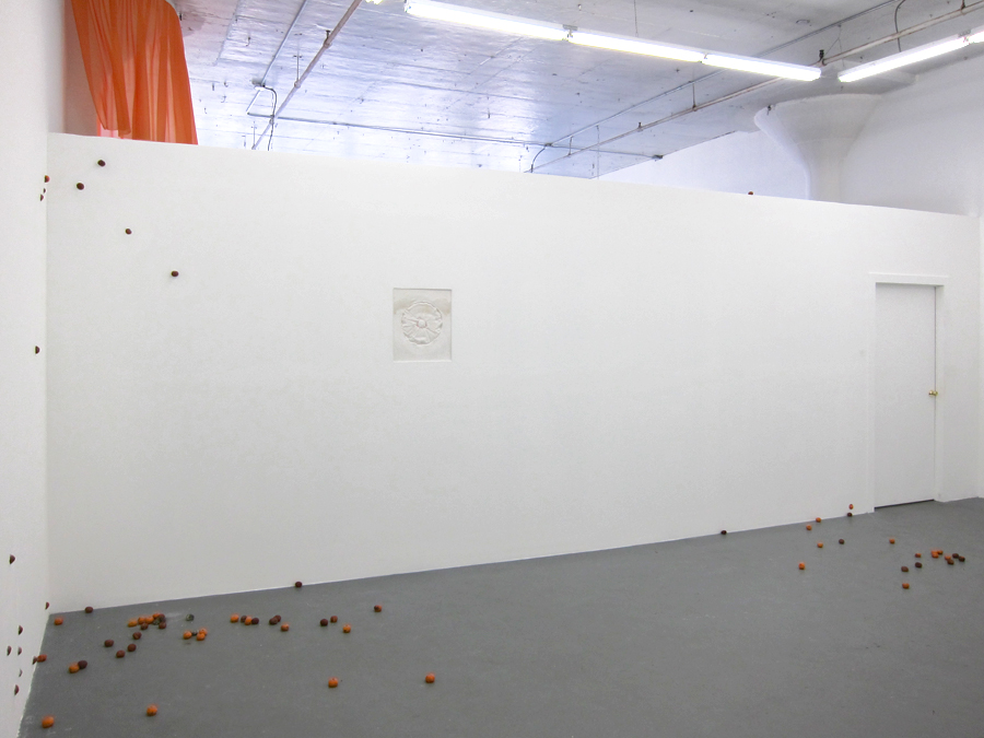 Infiltrating the interior of the gallery at Regina Rex, Tracey Goodman disrupts the familiarity of the preexisting architecture through a number of incisive modifications to the space. Working with materials such as plaster, fabric, clementines, drywall and plumbing, this installation unfolds subtly into its environment and furtively walks the border between the decorative and the utilitarian. With a title borrowed from a short story of the same name by Lydia Davis, Cockroaches in Autumn similarly constructs a distinctive sense of place out of the relationship between obstinate and invasive components, rather than providing a concrete statement telling you exactly where you are. Tracey Goodman was born in Warren, Ohio. She currently lives and works in Brooklyn, NY. She received her MFA from New York University and her BS from the Rochester Institute of Technology. She has attended the Skowhegan School of Painting and Sculpture and has participated in the Artist in the Marketplace program at the Bronx Museum. She has been included in the numerous group exhibitions: One and Three Quarters of an Inch at St. Cecilia's Convent, Brooklyn; I stepped into the room at Tina Kim Gallery, NY; Two Way Miracle at Peres Projects, Berlin; Host at the Soap Factory, Minneapolis; and the Emerging Artists Show at Smack Mellon, Brooklyn.