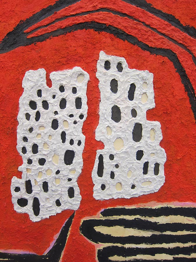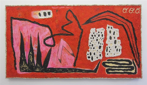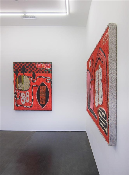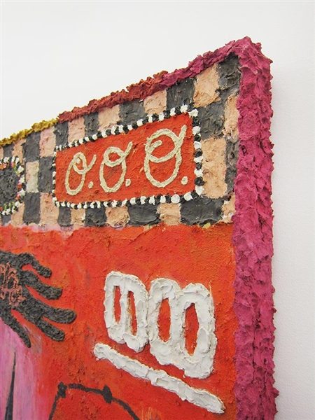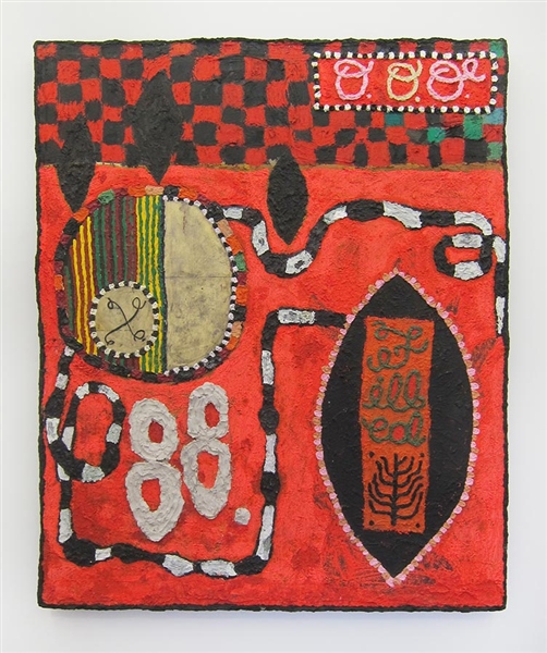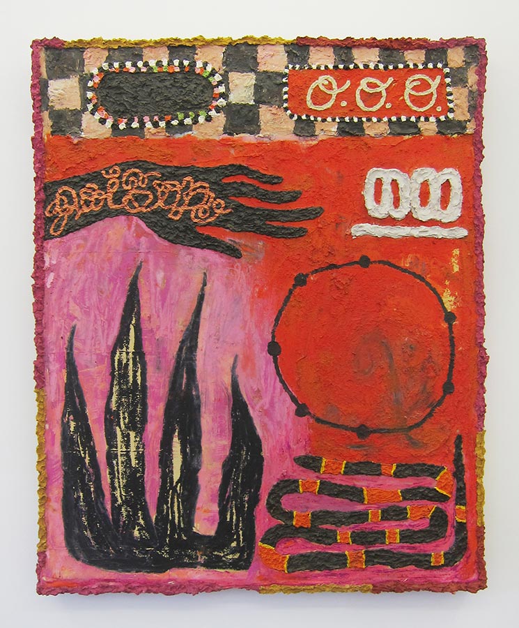 Regina Rex is very pleased to present a solo show of new work by Brooklyn artist Britta Deardorff at Bunker259. Drawing on intuition, symbolism, and innate graphic powers, Deardorff creates charged images in which archetypal iconography, text, and checkerboard patterns overlay and cultivate an aggressive physicality. Deardorff incorporates sawdust, clay, and sand into her paint to create an earthen rocky texture, an effect of naturalism which is then contradicted by a surface coating of saturated reds, fluorescent oranges, discordant fertile greens, whites and blacks. In combination with the recurrence of snakes, silhouetted hands, and spiky tendrils the sum effect is one of animus and an anxious mysticism.