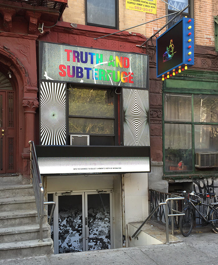 Rooted in the visual vocabulary of the artist's book Truth and Subterfuge (co-authored with Whitney Platt), Typaldos presents images designed for the facade of the gallery. Adapting some of the quotidian illustrations used in the book, Typaldos creates beacons that are at times ominous, abrasive and melancholic. The predominantly black and white displays recall 1960's Op Art and conceptual text-based practice while responding to the gallery's Chinatown location, in which both traditional and neon signage dominate the ocular landscape. He integrates Platt's text simultaneously as affective poetry, and a deadpan, non sequitur rupture within commercial advertising. The modernist black and white camouflage covering the entrance to the gallery also contains imagery that changes with the transition to evening. Truth and Subterfuge is a collaborative artist's book by Whitney Platt and Nickolaus Typaldos. In the volume, which locates the uncanny in the everyday, Typaldos presents an idiosyncratic collection of digitally and physically manipulated images that is companionate with Platt's dream-like and, at times, humorous poetry. Platt deftly constructs episodic and circuitous scenes that alternate between novel specificity and experiential abstraction. He mines aging in the context of American popular culture, and the temptations of nostalgia, with a tone that evokes elements of the tragicomic and melodramatic horror. In Truth and Subterfuge, his text is in dialogue with Typaldos' pastiche of tropes, forms and mediums 'both art-historical and commercial' of the post-World War II era. His work is fundamentally collage, remixing the analogue and digital, the physical and virtual, freely-- perceptual play marked by an ever-relatable sense of doubt. Truth and Subterfuge is an engaging and droll document of decay and regeneration, earnest meaning-making that relays more questions than answers. Truth and Subterfuge Whitney Platt and Nickolaus Typaldos Published by Press Editions, 2015. Edition of 250 Softcover, 8 x 5.5 in , Indigo Digital, 72 pages, perfect bound with die-cut cover