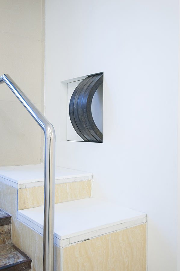 Matthew Schrader Untitled, 2016 Rubber window gasket, carbon transfers, rust and hardware 24 x 12 x 12 inches